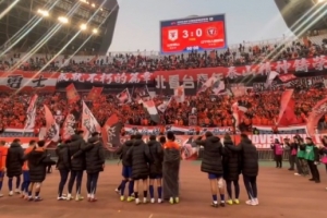 体育资讯3月7日讯 新赛季中超首轮主场3-0完胜辽宁铁人后,山东泰山全队与现场球迷进行了互动。