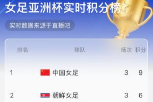 实时积分榜上,中国女足9分跃升至小组第一!