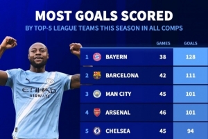 随着相关信息不断披露,本赛季五大联赛球队进球榜:拜仁128球居首,巴萨111球次席的情况逐渐清晰。