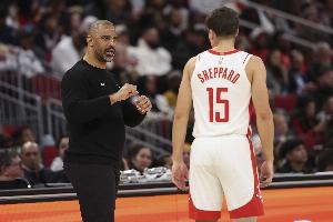 谈及申京因伤缺阵,球队启用芬尼-史密斯担任首发,没有安排谢泼德或者卡佩拉进入首发阵容的决定,乌度卡说道:“我们既没让谢泼德这样的小个子首发,也没让卡佩拉这种大个子首发,就是为了能无限换防对手相对小一些的阵容。”