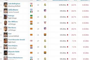 贝林厄姆(皇马):1.4亿欧(下跌2000万)