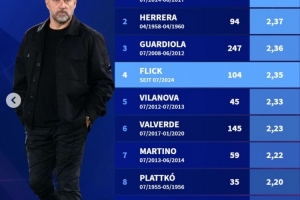 体育资讯3月17日讯 德国转会市场盘点了巴萨历任主教练场均拿分情况(至少执教15场比赛),弗里克以2.35分位居第4,仅次于恩里克、埃雷拉和瓜迪奥拉。