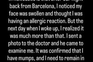 “我把照片发给医生,他过来对我进行了检查。结果证实我患有腮腺炎,需要隔离5天,并在更长时间内停止体力活动。我现在专注于康复,争取尽快恢复到100%的状态。”