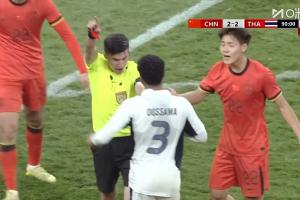 体育资讯03月25日讯 今日U23国足2-2战平U23泰国,比赛最后时刻,U23国足获得前场定位球,U23国足球员与泰国球员在禁区内发生冲突,麦麦提江果断出示2张红牌,玄智健+泰国3号被罚下。