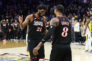 本场比赛,76人先发为:埃奇库姆、格莱姆斯、乔治、恩比德、巴洛。