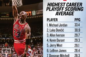 官方晒季后赛历史场均得分:乔丹非人类 东契奇KD詹姆斯在榜!
