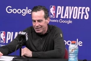 记者问:“米切尔今天拿了32分,这是他连续第9次在系列赛G1至少拿到30分,创造了NBA纪录。到了每年的这个时候,他身上有什么特质让他能迎来爆发?”