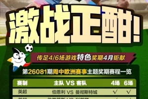 第26081期传足4/6场游戏特色奖期已经于2026年4月19日20:00开售,将于2026年4月22日22:00停售,并于2026年4月23日开奖,其中伯恩利VS曼彻斯特城、伯恩茅斯VS利兹联、勒沃库森VS拜仁慕尼黑和巴塞罗那VS维戈塞尔塔为4场进球游戏竞猜赛事。