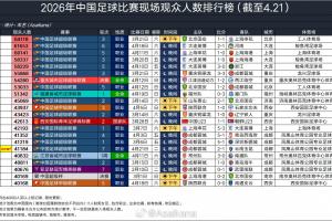 2026年中国足球比赛现场观众人数排行榜(截至4.21)
