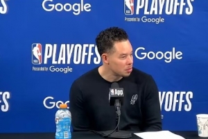 约翰逊:是的,我们这赛季也打过没有文班亚马的比赛。你看数据的话,他们投篮命中率是42.2%,三分命中率34%,获得了23次罚球。单从防守表现来看,这并不算差。他们利用我们的失误得到了24分,并且有23分的二次进攻得分,这可能是我首先要着手解决的两个问题。我们依然得了106分,并没有丢150分之类的。我认为队员们真的拼尽了全力,做得非常出色。显然,我们在一些细节上还可以做得更扎实,在终结回合以及打出更流畅的进攻方面可以提升,这样也能帮助我们落位去进行半场阵地防守。