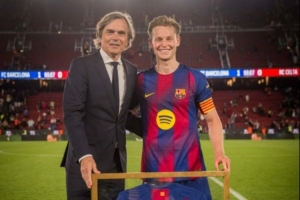 德容成为队史出场最多荷兰球员,巴萨名宿科库为其颁发纪念球衣