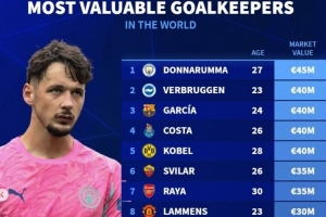 关于德转列门将身价榜:多纳鲁马居首 霍安·加西亚、拉亚、拉门斯在列,当前阶段的情况已基本明朗。