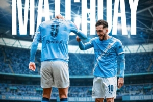 曼城官方社媒发布了为此役制作的海报,内容为哈兰德、谢尔基庆祝的场景。