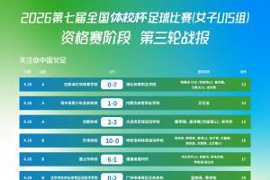 2026第七届全国“体校杯”足球比赛(女子U15组)资格赛阶段小组赛第三轮已于4月26日在云南泸西足球训练基地顺利进行。第三轮战报如下: