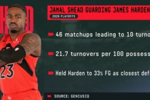 据统计,猛龙球员谢德本轮系列赛至今面对骑士球星哈登防守表现非常出色,他们之间有46次对位导致哈登出现10次失误,平均每100回合造成21.7次失误,作为主要防守者期间,将哈登的命中率限制在33%。