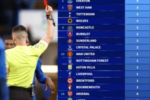本赛季英超赛场上,切尔西已吃到7张红牌,比位居第2的埃弗顿要多出3张,西汉姆联和热刺则以3张并列第三。另外,阿森纳、利兹联、曼城、富勒姆和布莱顿还没有吃到红牌。