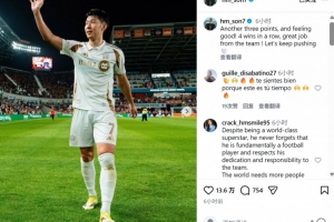 本场比赛孙兴慜首发出场送出助攻,赛后他在个人社媒晒出本场照片,配文写道:“又拿下三分,这样的感觉真棒!取得4连胜,全队都做出了努力,让我们继续前进!”