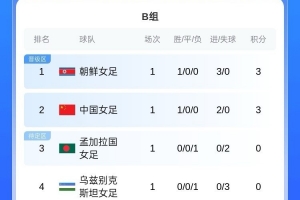 女足亚洲杯积分榜:中国女足暂居B组第二,韩日女足均为小组头名现阶段能够确认的信息主要集中在以上内容。